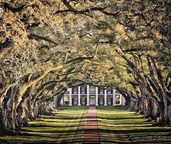 橡树巷种植园的树隧道长约240米,两旁的小橡树在18世纪初栽种。此后很久,照片中的房屋才开始建造。