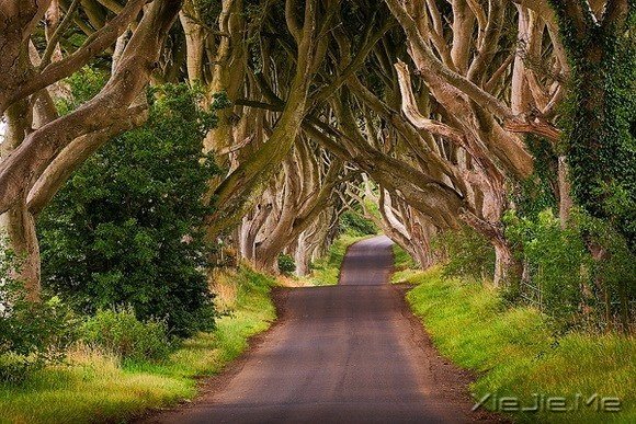 这个美幻得如同绘画的榉树隧道被当地人称为“黑暗树篱”,距今已有大约300年的历史。据称在18世纪,詹姆斯·斯图尔特种植下了150棵山毛榉,以在路途中向前来他庄园的宾客炫耀。